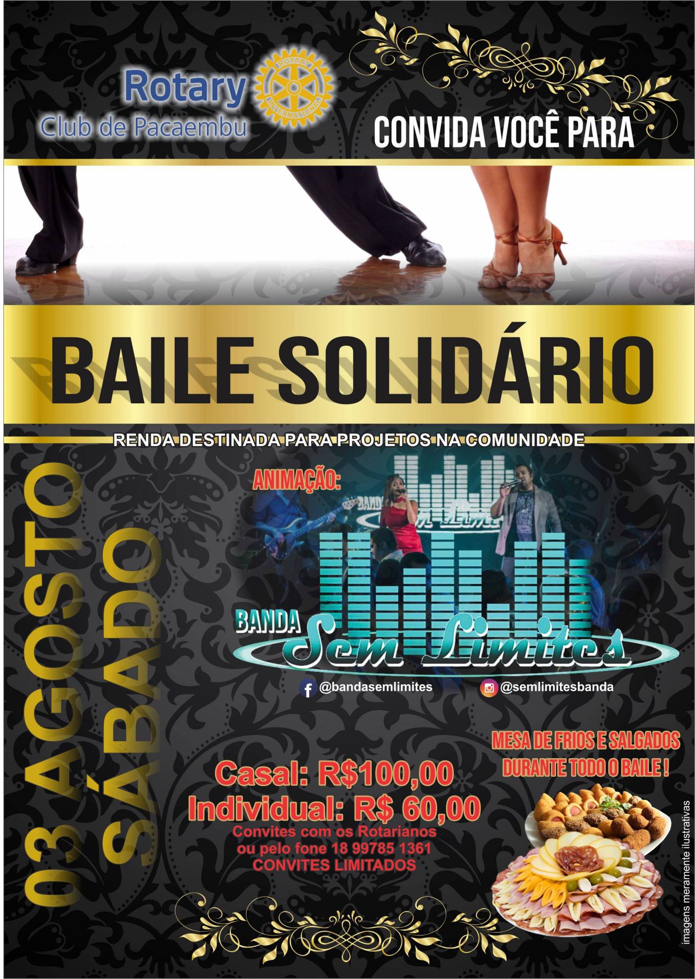 Na noite do dia 03 de agosto próximo, acontecerá nas dependencias do RC de Pacaembu, maravilhoso Baile com animação da Banda SEM LIMITES de Adamantina. Convites limitados direto com os rotarianos do clube ou pelo fone 18 99785 1361, com o secretário José Borges. Baile destinado a reserva de fundos para projetos na comunidade.
